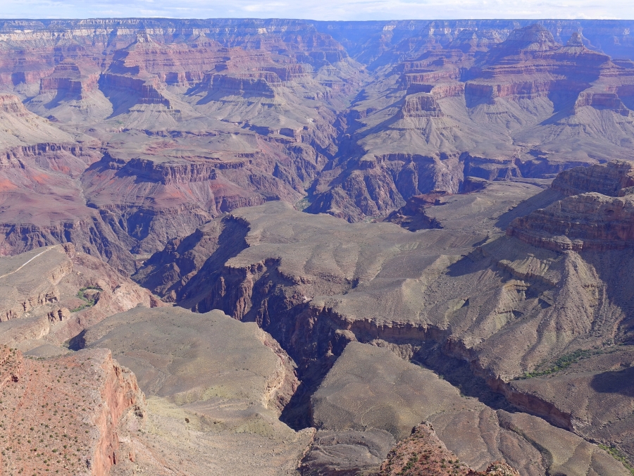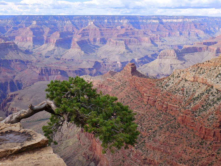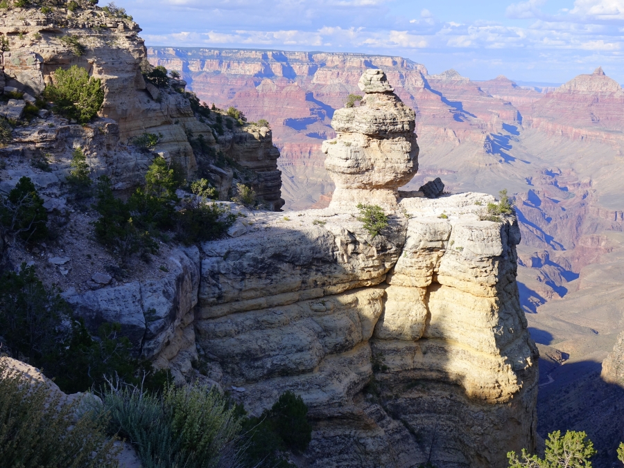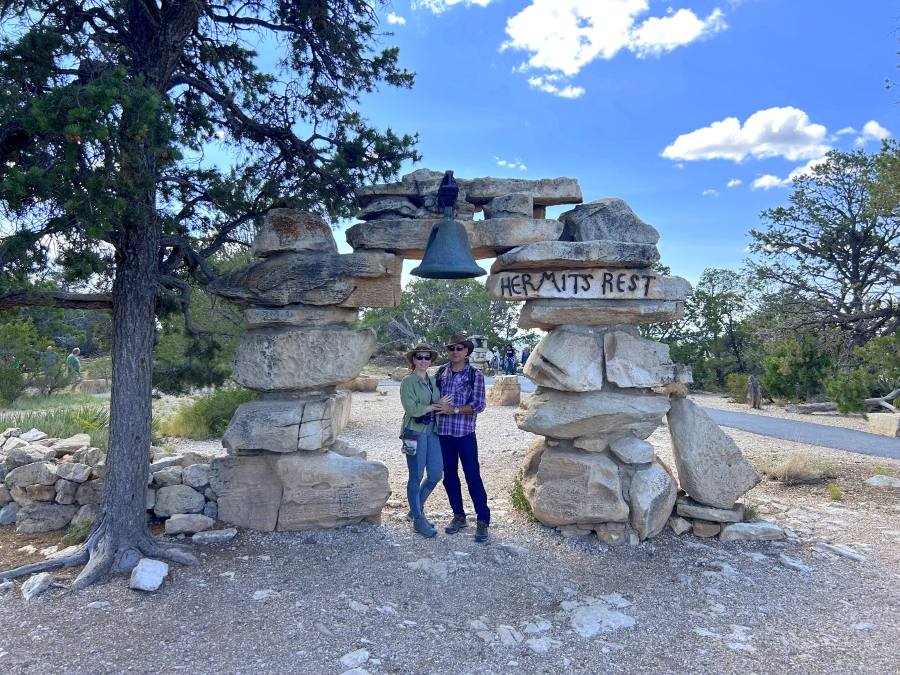 Az itt töltött 2 nap alatt alaposan bejártuk a kanyonrendszer déli peremét. Elsőként a kanyon déli peremének központi részéhez és látogatóközpontjához mentünk. Miután körbejártuk a látogatóközpontot, kisétáltunk a perem itteni szakaszához és kilátópontjaihoz. Elsőként az ikonikus Mather Pointról csodáltuk meg a panorámát, majd innen nyugati irányba indultunk, és gyalogosan túráztunk a perem mentén az innen kb. 1 km-re levő Yavapai Pointig és az ott található múzeumig, random kilátásokban gyönyörködve a perem különböző pontjairól. Innen visszasétáltunk a kiindulási pontunkhoz, és felültünk az egyik transzferbuszra, amellyel a perem nyugati részét jártuk be. A nemzeti park bizonyos részein ugyanis közlekednek ingyenes transzferbuszok, melyek megkönnyítik, és gazdaságosabbá teszik a park bejárását, így mindenhol igénybe vettük őket, ahol volt ilyen lehetőség. A következő néhány órában bejártuk a déli perem teljes nyugati részét, leszálltunk minden kilátópontnál, majd a következő járattal mentünk tovább. Az első kilátópont a Trailview Overlook, a második a Maricopa Point, a harmadik pedig egy nagyon különleges megálló, a Powell Point volt. Ezt a kilátópontot John Wesley Powell amerikai geológusról és felfedezőről nevezték el. Ő vezette ugyanis az első expedíciót 1869-ben, amely végighajózta a Colorado folyót a Grand Canyonon keresztül. Található itt egy gránit emlékmű az expedíció tiszteletére, és itt tartották a nemzeti park 1919-es megnyitóját is, így ez a pont a lenyűgöző kilátás mellett egy extra érdekességet rejt, és többletjelentéssel bír. Ezután a Hopi Point, majd a Mohave Point következett. Innen a The Abyss nevű kilátóponthoz mentünk, amit a Monument Creek Vista követett a sorban. Az utolsó előtti kilátópont a Pima Point volt, az út végállomása pedig a Hermit's Rest nevű, történelmi pihenőhely és látogatóközpont, amely voltaképpen egy rusztikus stílusú ház, ami 1914-ben épült, és a park egyik ikonikus látnivalója, ahonnan a kilátás is pazar. A házban ajándékbolt, információs iroda és egy kávézó is található.