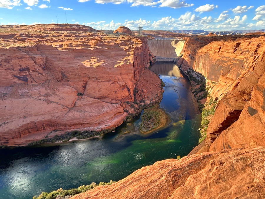 Közvetlenül a város mellett található a Glen Canyon-gát is, ami egy hatalmas boltíves gát a Colorado folyón. A gát látogatóközpontjában érdekes kiállításokat és kisfilmeket nézhettünk végig a gátról, majd átsétáltunk a gáttal szemben fekvő hídon, ahonnan csodás kilátás nyílt magára a gátra, a Colorado folyó kanyonjára, valamint a gát által felduzzasztott Powell-tóra. Ezután végigmentünk egy panorámaúton Page városa mellett, és kilyukadtunk a Dam Overlook Trail nevű túraösvénynél, amelyre teljesen véletlenül találtunk rá. Az ösvényen letúrázva, elértünk egy kilátópontot, ahonnan messzebbről és magasabbról is szemügyre vehettük a gátat és a kanyont. A sziklafalak tetején ki tudtunk menni egészen a kanyon peremére, ahonnan elképesztő volt látni a kanyont és a folyót. Egy igazi rejtett gyöngyszemre bukkantunk, ahol teljesen egyedül élvezhettük a csodás atmoszférát.
