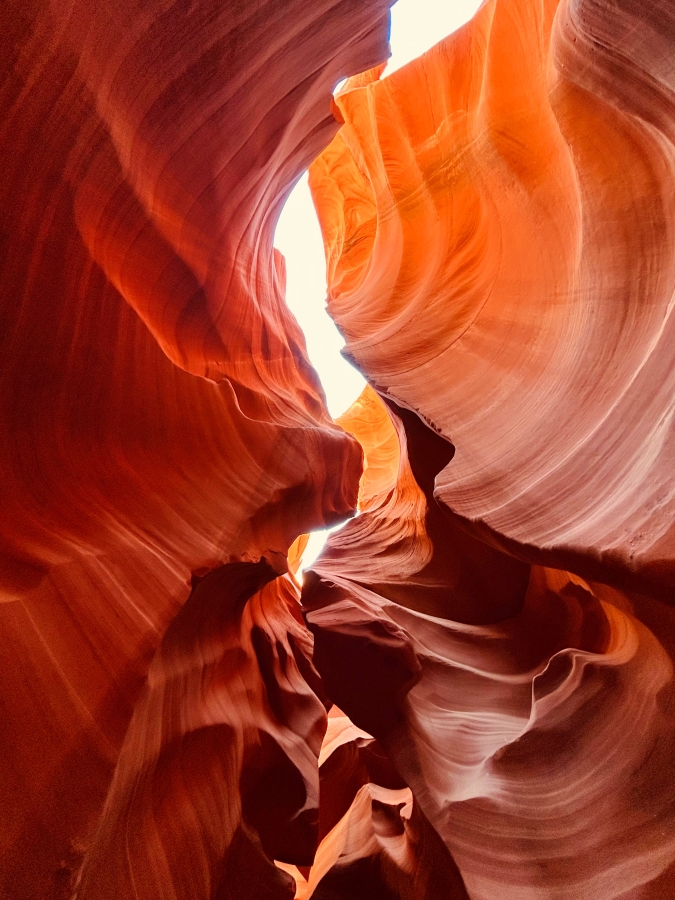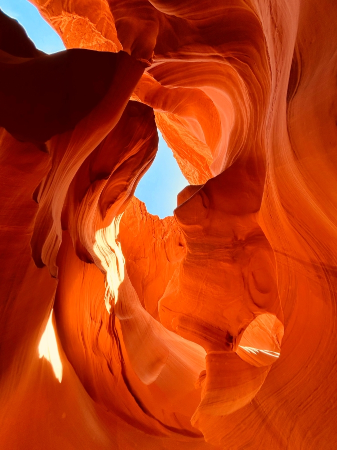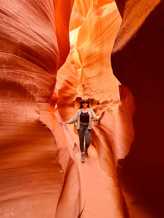 A legfőbb attrakció ezen a környéken, amiért elsősorban ellátogattunk ide, a világhírű és szintén ikonikus Antilop-kanyon, melynek az alsó szakaszát (Lower Antelope Canyon) fedeztük fel. A kanyon a navahó indiánok területén fekszik, és csak vezetett túrával, a helyi indián túravezetők kíséretében látogatható. A túra ára 100 USD, és érdemes közvetlenül a hivatalos weboldalon foglalni, mert ott a legolcsóbb. Nagy a kereslet ezekre a túrákra, és a világ minden tájáról érkeznek ide látogatók, ezért érdemes hónapokkal előre foglalni és dél körüli időpontot választani az optimális fényjáték érdekében. A túra kb. másfél óráig tartott, melynek során kisebb csoportokra osztottak minket, és minden csoport kapott egy saját idegenvezetőt. Először egy 10 perces séta következett a sivatagban a kanyon bejáratáig, ahol az idegenvezetőnk tartott egy rövid eligazítást. Ezután leereszkedtünk a kanyonba egy hosszú lépcsősoron, és megkezdődött a túra lényegi része, ami nagyjából egy óráig tartott a kb. 1 km hosszú kanyonban. Szűk járatokon haladtunk, helyenként létrákon másztunk le és fel, s nem győztünk gyönyörködni a szürreálisan szép és szinte hullámzó sziklafalakban. Egyes szakaszokon szinte összezárultak a sziklafalak a fejünk felett, és egy-egy kanyar annyira keskeny volt, hogy behúzott hassal kellett átpréselnünk magunkat a szűk járaton. A szűk hely miatt fejenként egy kulacs vizet és telefont engedélyezett vinni a túrára, semmilyen egyéb tárgyat vagy táskát nem vihetünk magunkkal. Néhány helyen a túravezetőnk megmutatta, hogy milyen szögből érdemes fényképezni, segített a megfelelő beállításokban, és közös képeket is csinált rólunk, videózni viszont szigorúan tilos a túra során. Noha a túra létszáma erősen limitált, az volt a benyomásunk, hogy túl sok embert engednek be egyszerre a kanyonba. Kicsit sietősen kellett haladni, és amikor szerettünk volna lemaradni fotózni, máris a nyakunkban volt a következő csoport. Ez rontott egy picit az amúgy fantasztikus helyszín hangulatán és a kalandfaktoron, de így is különleges felvételeket sikerült készítenünk, és lenyűgöző élmény volt az egész túra.