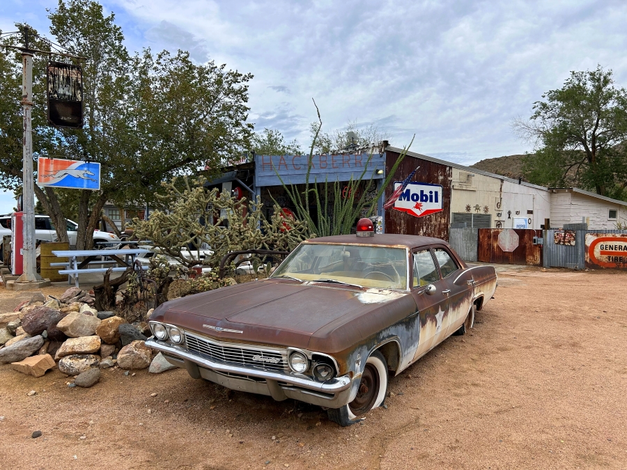 A következő látnivalónk a 66-os út mentén Hackberry volt, ami egy klasszikus útszéli pihenőhely, múzeum és ajándékbolt a semmi közepén. Az udvaron autóroncsok hevernek, az épület előtt egy benzinkút maradványait találjuk, a boltban pedig számos régiségre és szuvenírre bukkanhatunk. Egy igazi és roppant hangulatos időutazás az egész. Amikor a bolt tulaja nekiállt retró slágereket gitározni és énekelni, teljesen magával ragadott minket a nosztalgikus hangulat, és megható volt látni, ahogy az idősebb generáció tagjai próbálják megőrizni egy letűnt korszak szellemiségét és hangulatát. Nagyon érdekes volt bejárni a roncstemetőt és a szuvenírboltot is, de abban a pillanatban, amikor megláttunk egy táblát, mely kígyóveszélyre figyelmeztetett, véget ért a Hackberryben tett látogatásunk, és spuriztunk vissza a lakóautóhoz. A terület meglátogatása egyébként ingyenes, de adományokat szívesen elfogadnak, és nagyon örülnek a támogatásnak - tíz dollárt adtunk nekik belépő gyanánt.