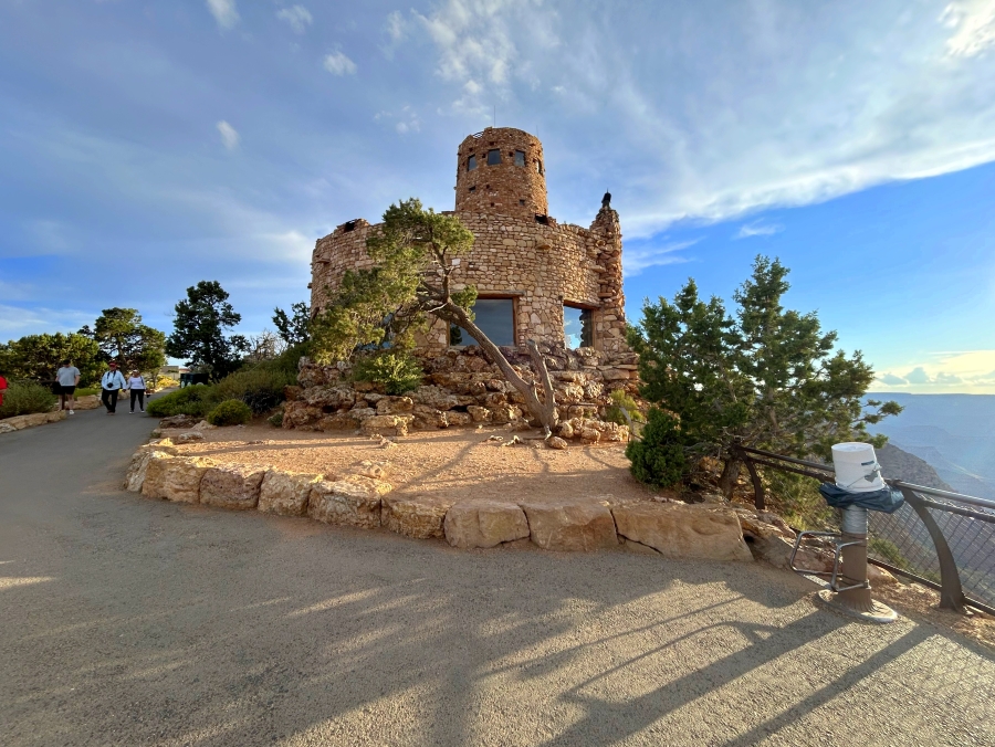 Másnap felfedeztük a kempingünk környékét, ahol a Desert View Watchtower épülete is megtalálható. A 21 méter magas torony 1932-ben épült, és ugyanaz a Mary Colter tervezte, aki a perem másik ikonikus épületét, a Hermit's Restet is megalkotta. Ez a torony is tudatosan lett rusztikus, régies stílusú, és szándékosan kelt omladozott hatást, hogy természetesen illeszkedjen a tájba. A torony az indián kultúrák előtt tiszteleg, akik ezen a területen éltek, így a belső falakat ősi indián motívumok díszítik, és számos utalást találhatunk a népi kultúrákra. A torony tetejéből elképesztő, 360 fokos panoráma nyílik a Grand Canyonra és a Colorado folyóra, de a legjobban a toronyhoz tartozó terasz tetszett, ahol még sokáig elidőztünk, gyönyörködve a kilátásban.