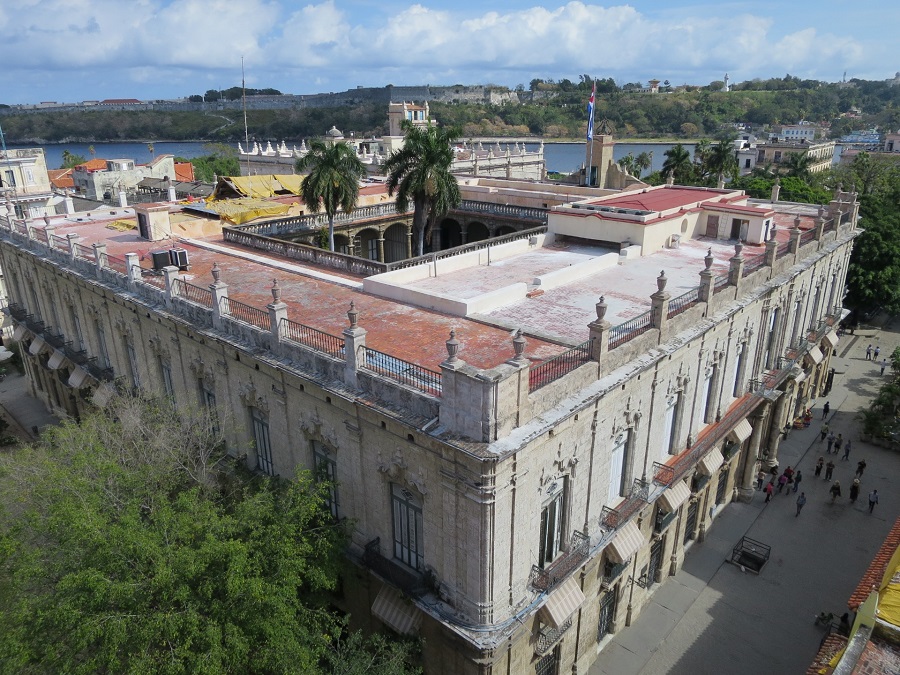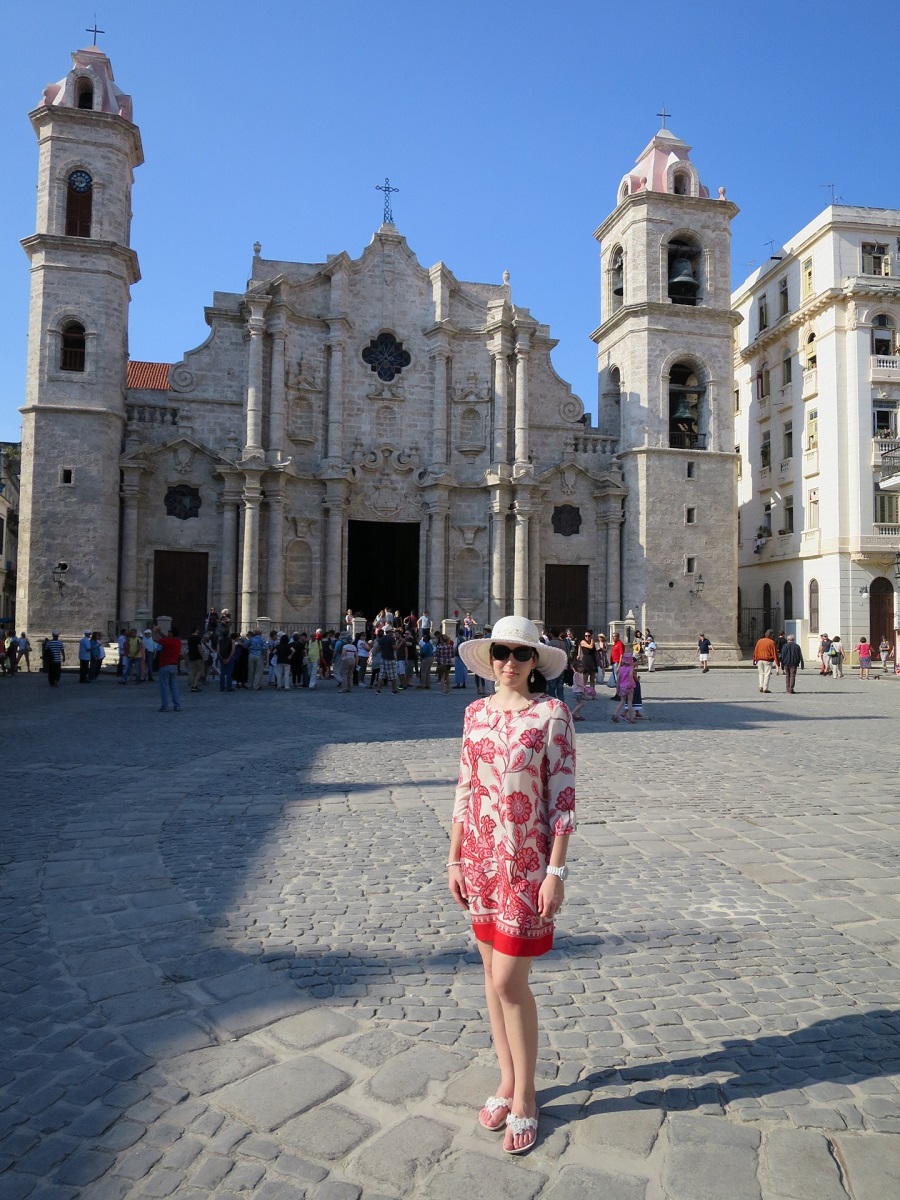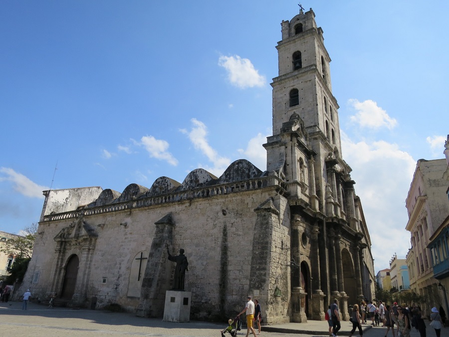 Ekkor már Habana Vieja negyedben voltunk, így ezután gyalog indultunk tovább felfedezni e negyed többi részét, ami gyakorlatilag a történelmi városmag, az óváros, mely az UNESCO Világörökség része. Macskaköves, romantikus, történelmi hangulattal átitatott tereken és utcákon lehet errefelé órákon át andalogni. Elsőként a Plaza San Francisco de Assisi nevű tér esett utunkba, amelynek két érdekessége van: a téren álló régi katedrális, melyről a teret is elnevezték, és a Párizsi Lovagként emlegetett szobor. Szakállának és ujjának megdörzsölése állítólag szerencsét hoz, így természetesen mi sem hagytuk ki ezeket a mozdulatokat. A leghíresebb tér a Plaza Vieja (Óváros tér), ahol éppen egy modern művészeti kiállítás is zajlott: nagy műanyag kutyák voltak egy hatalmas körben kiállítva, amiket kortárs művészek festettek le. Mindegyik kutya egyedi mintázatú volt, és más-más színekben pompázott. Ezután beültünk ebédelni egy étterembe, majd folytattuk sétánkat az óvárosban. Elmentünk a Castillo de la Real Fuerza nevű középkori erődhöz, mely a legrégebbi és leghíresebb erőd Havannában, és ami a spanyol gyarmati építészet egy ékes darabja. A macskaköves udvaron hatalmas ágyúk állnak, az erőd belsejében pedig egy kis múzeum üzemel. Ezután megnéztük a Plaza de la Catedralt (Katedrális tér), ahol egy a szintén spanyol gyarmati időkből származó, tekintélyes katedrális áll, a legnagyobb és leghíresebb Havannában. A katedrálist belülről is megnéztük, majd megpihentünk egy kicsit a téren. Végül a Plaza de Armas (Fegyverek tere) nevű térrel zártuk óvárosi sétánkat, ahol kellemesen meg lehet pihenni egy kis parkban, melynek a közepén egy szobor áll. Innen kisétáltunk a tengerpartra, és ott indultunk el visszafelé, a szállásunk irányába. Így érkeztünk el a Maleconig, a híres, 7 km hosszú tengerparti sétányig. Innen megcsodálhattuk az öböl túloldalán, egy földnyelven álló másik erődöt (Castillo el Morro), ahol egy világítótorony is áll. Ezután sétálgattunk, andalogtunk, nézelődtünk még egy kicsit a naplementében a Maleconon, ami igazán hangulatos volt. Amikor már szinte teljesen besötétedett, fogtunk egy taxit, és visszamentünk a szállodához. Ezúttal egy sárga kókusztaxit próbáltunk ki, ami szintén egy autentikus és jópofa közlekedési eszköz Havannában.