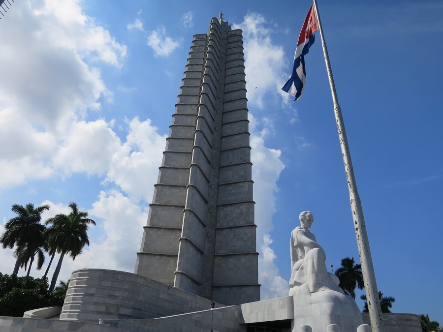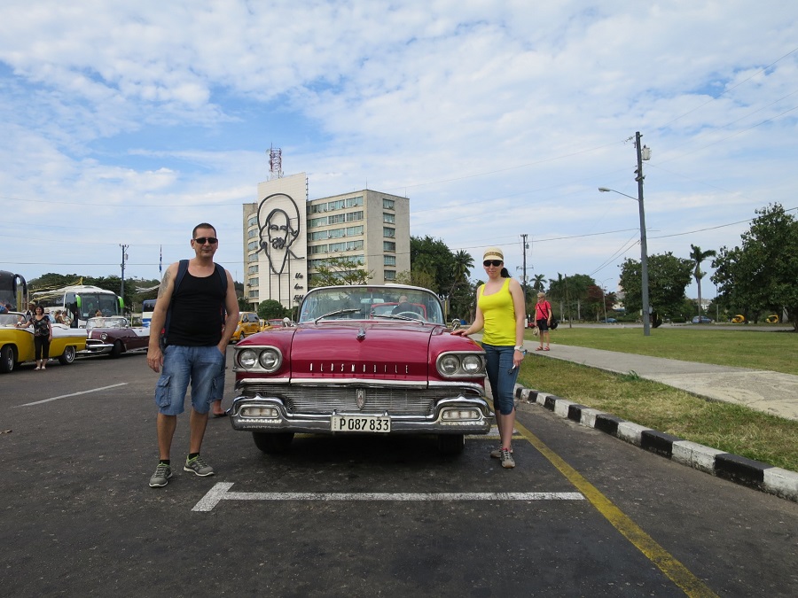A második napunk reggelén ismét egy oldtimerrel mentünk be a belvárosba, de ezúttal egy lepukkant, csörgő-zörgő, rozsdás, huzatos, vagyis egy abszolút autentikus oldtimert fogtunk ki. Vicces és kalandos volt vele utazni, így legalább kipróbálhattuk a valódi kubai autózás élményét is. Első megállónk a Plaza de la Revolución (Forradalom tér) volt, ami egy hatalmas tér Havanna egyik modernebb, Vedado nevű negyedében, és ami fontos történelmi események színhelyéül szolgált az elmúlt évtizedekben. Körbejártuk a teret, lefotóztuk a két hatalmas arcképet, mely 2 híres kubai ember portréja (Che Guevara - forradalmár, Camillo Cienfuegos - miniszter), és amelyek 2 magas épület 1-1 oldalát foglalják el. Az épületekkel szemben, a tér másik oldalán pedig a híres és elképesztően magas José Marti-emlékmű áll. José Marti szintén egy híres kubai ember, aktivista, politikus, aki egész életében a kubaiak jogaiért és szabadságáért harcolt. Egyfajta nemzeti hősként tekintenek rá az ottani spanyolok. Olyan szabadságharcos volt, mint mondjuk nálunk Petőfi Sándor vagy Kossuth Lajos. Körbejártuk az emlékmű földszintjén található José Marti-múzeumot, amihez egy privát, angol nyelvű idegenvezetést is kaptunk, és megnéztük az emlékmű előtt álló hatalmas José Marti-szobrot. Van egy lift is, mellyel fel lehet menni az emlékmű tetejére, ahonnét pazar kilátásban gyönyörködhetünk, de az idegenvezető közölte, hogy a lift - meglepő módon - nem működik, éppen felújítás alatt áll.