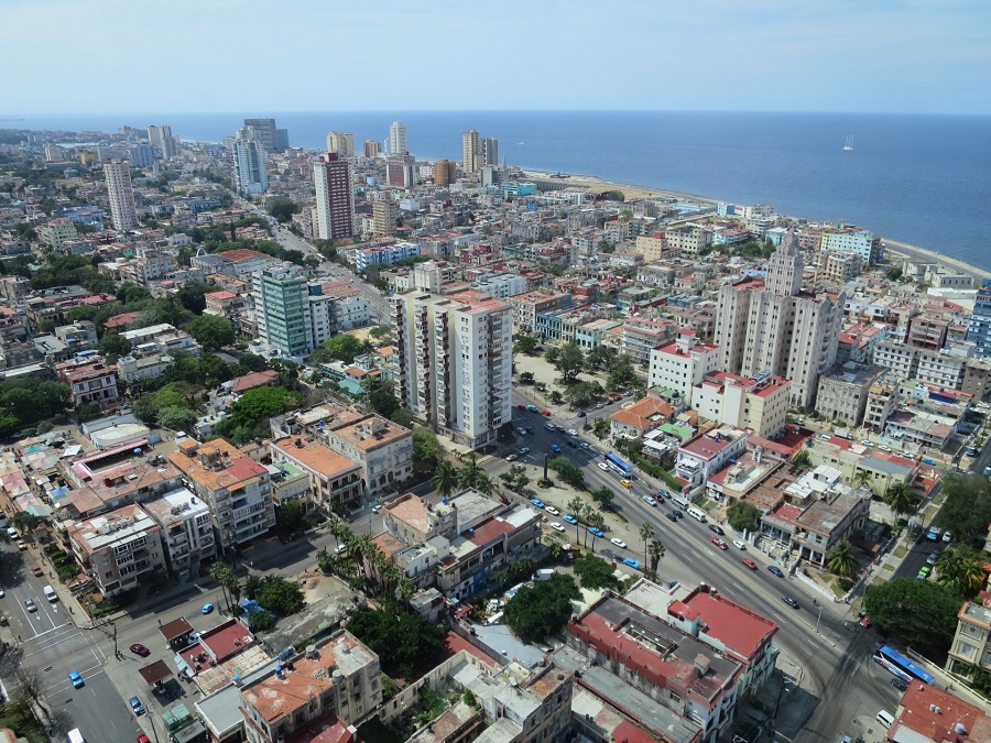 A bárban tett látogatásunk után szintén egy kókusztaxi szolgáltatását vettük igénybe, mellyel kivitettük magunkat a Maleconra, egész pontosan a Hotel Nacional elé, mely azért vált híressé, mert ez a szálloda volt annak idején az orosz és olasz maffiózók találka- és szálláshelye, ahol piszkos üzelmek és leszámolások folytak, valamint a hotel bárjában szintén gyakran megfordult a maga idejében Hemingway is. A hotel egy dombon áll, vele szemben fut a Malecon. Konkrétan ezen a részen korábban gyalog nem jártunk, ezért itt is akartunk még egyet sétálni. Kb. 1 órán keresztül andalogtunk, romantikáztunk a híres tengerparti sétányon, gyönyörködve az Atlanti-óceán kékségében és hullámaiban. Tettünk egy kört, majd visszaértünk a hotel elé, melynek közvetlen közelében áll egy magas épület, irodaház, melynek a legtetején egy körpanorámás kávézó található, ahonnét csodás kilátás nyílik az egész városra. Korábban ez a hely még nem szerepelt a terveink között, de nagyon szerettünk volna felmenni legalább egy ilyen kilátós helyre, ezért végül úgy döntöttünk, hogy ezt megnézzük. Odasétáltunk az épület bejáratához, ahonnét lift vitt minket fel a legfelső, 33. emeletre. Megittunk egy finom kávét, közben pedig gyönyörködtünk a pazar kilátásban. Körben az egész kávézóban, hatalmas üvegablakokon keresztül lehetett kémlelődni, így körbesétálva, 360 fokos panorámában volt részünk, a város minden részét láthattuk madártávlatból. Jelenleg ez a legmagasabb működő kilátó a városban, vagyis abszolút páratlan élmény felmenni ide, kár lett volna kihagyni. Ezután sétálgattunk még a Maleconon, majd végül egy kókusztaxival mentünk vissza a hotelbe. Nem sokkal vacsoraidő előtt értünk vissza a szállodába, így még pihentünk egyet, majd lementünk megvacsorázni, utána pedig kiültünk a hotel medencéjének partjára, mert éppen aznap este zajlott egy vízibalett-show, amelyet minden szerda este szoktak megrendezni ebben a hotelben, így mi is éppen meg tudtuk nézni. Kb. 45 percig tartott a show, mely során fiatal lányok és fiúk ugráltak a vízbe, majd ott, finom zene mellett, különböző akrobatikus mutatványokat hajtottak végre, ötvözve a gimnasztikát, a klasszikus balettet és a latin táncokat. Nagyon romantikus, különleges és pihentető élmény volt, ismét kaptunk egy kis ízelítőt az eredeti karibi zene-, tánc- és hangulatvilágból.
