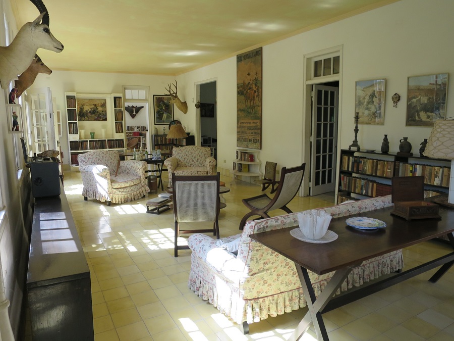 Első megállónk az óvárosban, a Fegyverek tere közelében lévő Hotel Ambos Mundos volt, amelyben Hemingway 7 éven keresztül rendszeresen megszállt, amikor Kubában járt. Több különböző szobában lakott, de az egyik szobát meghagyták eredeti állapotában, és berendeztek benne egy kicsi Hemingway-múzeumot. Láthatók itt könyvek, képek, személyes tárgyak, továbbá egy mellszobor a világhírű íróról, sőt, a vitrinben kiállított művei között megtaláltuk Az öreg halász és a tenger című regény első magyar kiadását is. A folyosókon és a földszinti hallban is sok-sok kép és tárgy került kiállításra Hemingway vonatkozásában, tehát az író szelleme és vele együtt egyfajta érdekes, történelmi hangulat teljesen átitatta eme nívós, elit, óvárosi szálloda egész épületét. Felmentünk a tetőteraszra is, ahonnét szép kilátás nyílt az óváros egy részére. Következő megállónk a Havanna külvárosában található Hemingway-birtok, Finca Vigia volt. Az író annyira jól érezte magát Kubában, hogy végül vásárolt egy hatalmas telket, rajta egy villával. Itt töltötte élete utolsó 20 évét, negyedik és egyben utolsó feleségével. Nagyon szeretett itt élni, itt töltötte élete legboldogabb időszakait. A ház minden szobájában meghagyták az eredeti berendezést, láthattuk az író személyes tárgyait, könyveit, trófeáit, íróasztalát, ruhatárát. Ezután egy hangulatos, pálmafákkal övezett sétányon át érkeztünk meg a birtok egy másik részére, ahol az úszómedencéjét és a kiállított halászhajóját tekinthettük meg. A birtok bejáratánál volt néhány ajándékbolt, alkalmunk nyílt egy kis vásárlásra, és kóstolhattunk frissen facsart cukornádkoktélt is.