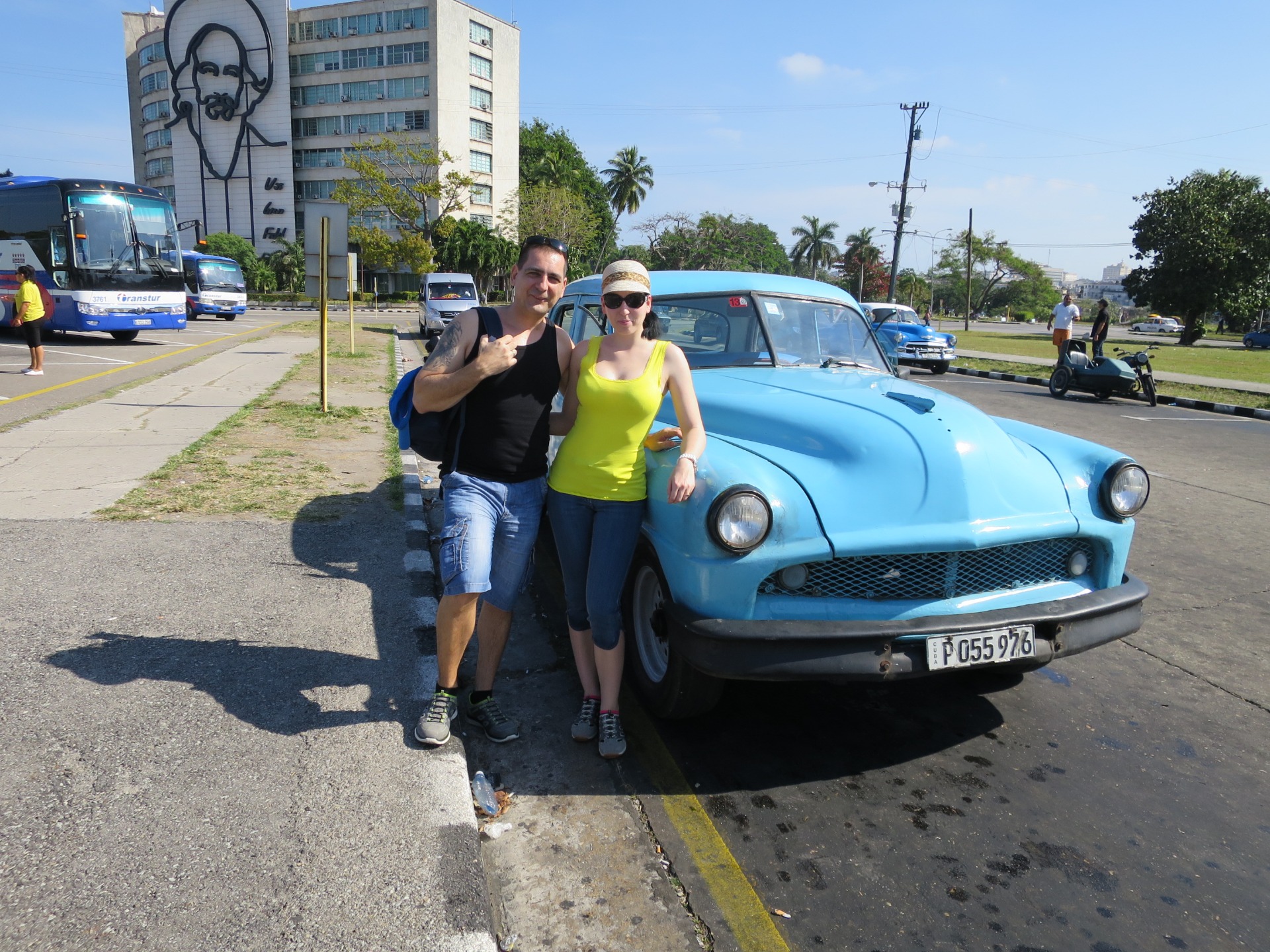 A második napunk reggelén ismét egy oldtimerrel mentünk be a belvárosba, de ezúttal egy lepukkant, csörgő-zörgő, rozsdás, huzatos, vagyis egy abszolút autentikus oldtimert fogtunk ki. Vicces és kalandos volt vele utazni, így legalább kipróbálhattuk a valódi kubai autózás élményét is. Első megállónk a Plaza de la Revolución (Forradalom tér) volt, ami egy hatalmas tér Havanna egyik modernebb, Vedado nevű negyedében, és ami fontos történelmi események színhelyéül szolgált az elmúlt évtizedekben. Körbejártuk a teret, lefotóztuk a két hatalmas arcképet, mely 2 híres kubai ember portréja (Che Guevara - forradalmár, Camillo Cienfuegos - miniszter), és amelyek 2 magas épület 1-1 oldalát foglalják el. Az épületekkel szemben, a tér másik oldalán pedig a híres és elképesztően magas José Marti-emlékmű áll. José Marti szintén egy híres kubai ember, aktivista, politikus, aki egész életében a kubaiak jogaiért és szabadságáért harcolt. Egyfajta nemzeti hősként tekintenek rá az ottani spanyolok. Olyan szabadságharcos volt, mint mondjuk nálunk Petőfi Sándor vagy Kossuth Lajos. Körbejártuk az emlékmű földszintjén található José Marti-múzeumot, amihez egy privát, angol nyelvű idegenvezetést is kaptunk, és megnéztük az emlékmű előtt álló hatalmas José Marti-szobrot. Van egy lift is, mellyel fel lehet menni az emlékmű tetejére, ahonnét pazar kilátásban gyönyörködhetünk, de az idegenvezető közölte, hogy a lift - meglepő módon - nem működik, éppen felújítás alatt áll.