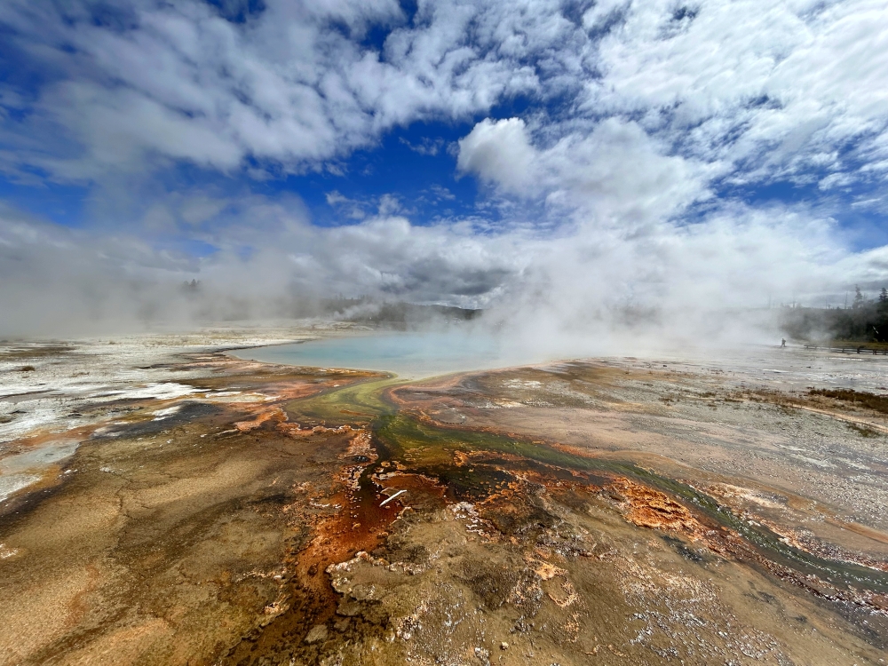 Artists Paintpots – ez a gejzírmező tényleg úgy fest, mintha művészek hagyták volna el maguk után a színes festőedényeiket. Gyönyörű medencéket és azok terjedelmes kifolyásait, gőzölgő domboldalakat, fel-feltörő gejzíreket láthattunk, de megtalálhatóak itt a kedvenceink, a dühösen fortyogó iszapvulkánok is, melyek forró sárcsomókat lövellnek a gyanútlan turistákra. Itt sikerült egy igazán művészi fotót is készítenem egy bugyogó iszapmedencéről, ami az egyik kedvenc felvételem lett a Yellowstone-ból.