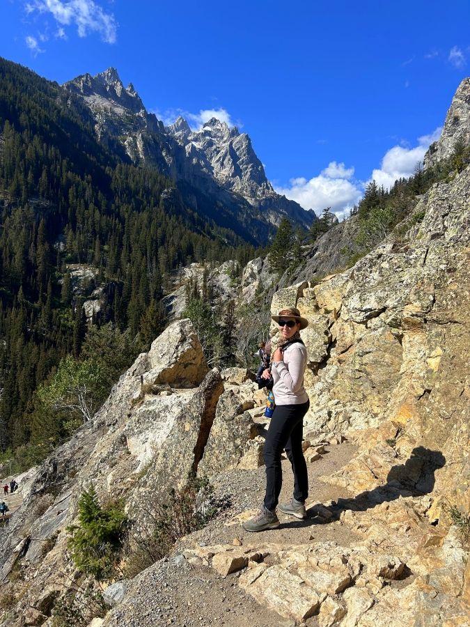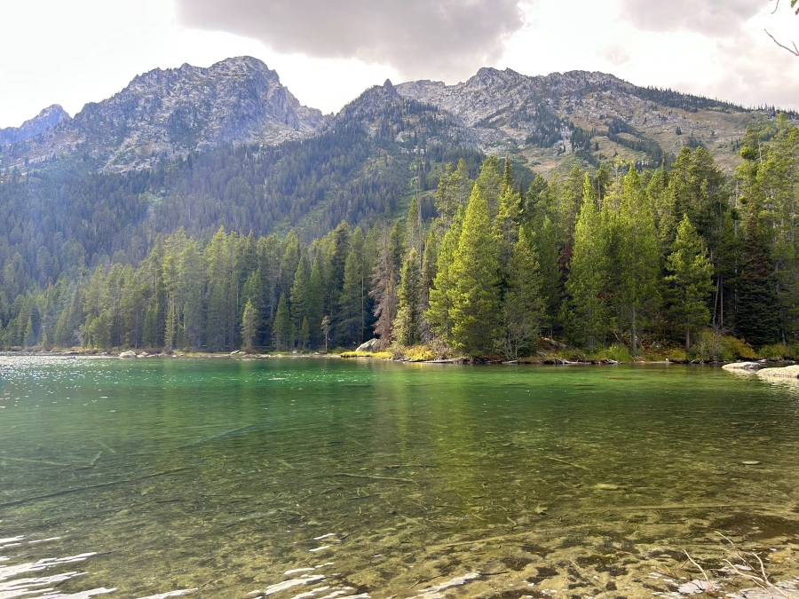 Két éjszakát vadkempingeztünk Wyoming egyik emblematikus települése, Jackson Hole mellett, a sűrű fenyőerdő szélén. Innen vágtunk neki a Grand Teton Nemzeti Park felfedezésének. A nemzeti park a Teton-hegylánc körül terül el, melynek érdekessége, hogy szinte váratlanul, előhegység nélkül emelkedik ki a síkságból, ezért drámai hatást kelt, és egy nagyon jellegzetes, fotogén látképet nyújt, ami Észak-Amerika egyik legikonikusabb és legtöbbet fotózott helyszínévé teszi ezt a parkot. Itt egy merőben más világba kerültünk, mint amilyenek az eddig bejárt nemzeti parkok voltak. A korábbi sivatagos, kietlen helyszínek után úgy éreztük magunkat, mintha az Alpokban kirándulnánk. Magashegyi, vadvirágos mezők, végtelen fenyőerdők, türkizkék gleccsertavak, vadregényes vízesések és gazdag élővilág jellemzik ezt a tájat. Az első dolgunk egy medvespray beszerzése volt a nemzeti park látogatóközpontjában. Mivel egy héten át folyamatosan medvelakta területen tartózkodtunk, túráztunk, kempingeztünk, ezért fontosnak tartottuk kikupálni magunkat a medvebiztonsági szabályokból és felkészülni minden eshetőségre. Wyoming nemzeti parkjaiban kétféle medve is honos: a feketemedve és a barnamedve egyik alfaja, a grizzly. Itt minden esély megvan rá, hogy összefussunk egy-egy példánnyal.